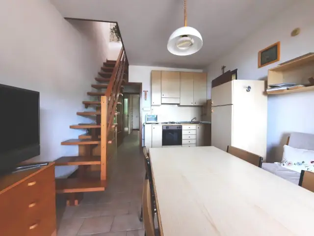 In paese ben attrezzato sito a circa 5 minuti d'auto dal mare, proponiamo appartamento in complesso ben curato e gestito. La soluzione si sviluppa su due livelli ed è così distribuita: ingresso, zona living con angolo cottura ed accesso diretto ad ampio terrazzo. Sullo stesso piano un disimpegno dà l'accesso ad un bagno con box doccia e una camera matrimoniale dotata di balcone esclusivo. Al piano superiore si trova un ambiente unico con lucernario, utilizzabile come seconda letto. Anche questo piano è dotato di un terrazzo con vista mare. Provvisto di infissi a doppio vetro e porta blindata. Riscaldamento autonomo. Completano la soluzione un garage triplo ed una cantina.