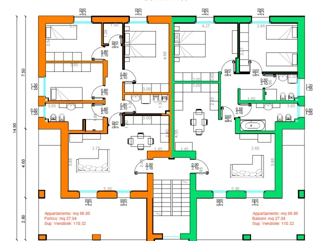 Al piano rialzato troviamo appartamenti di 100 mq, con annessi portico di 27 mq e giardino privato.